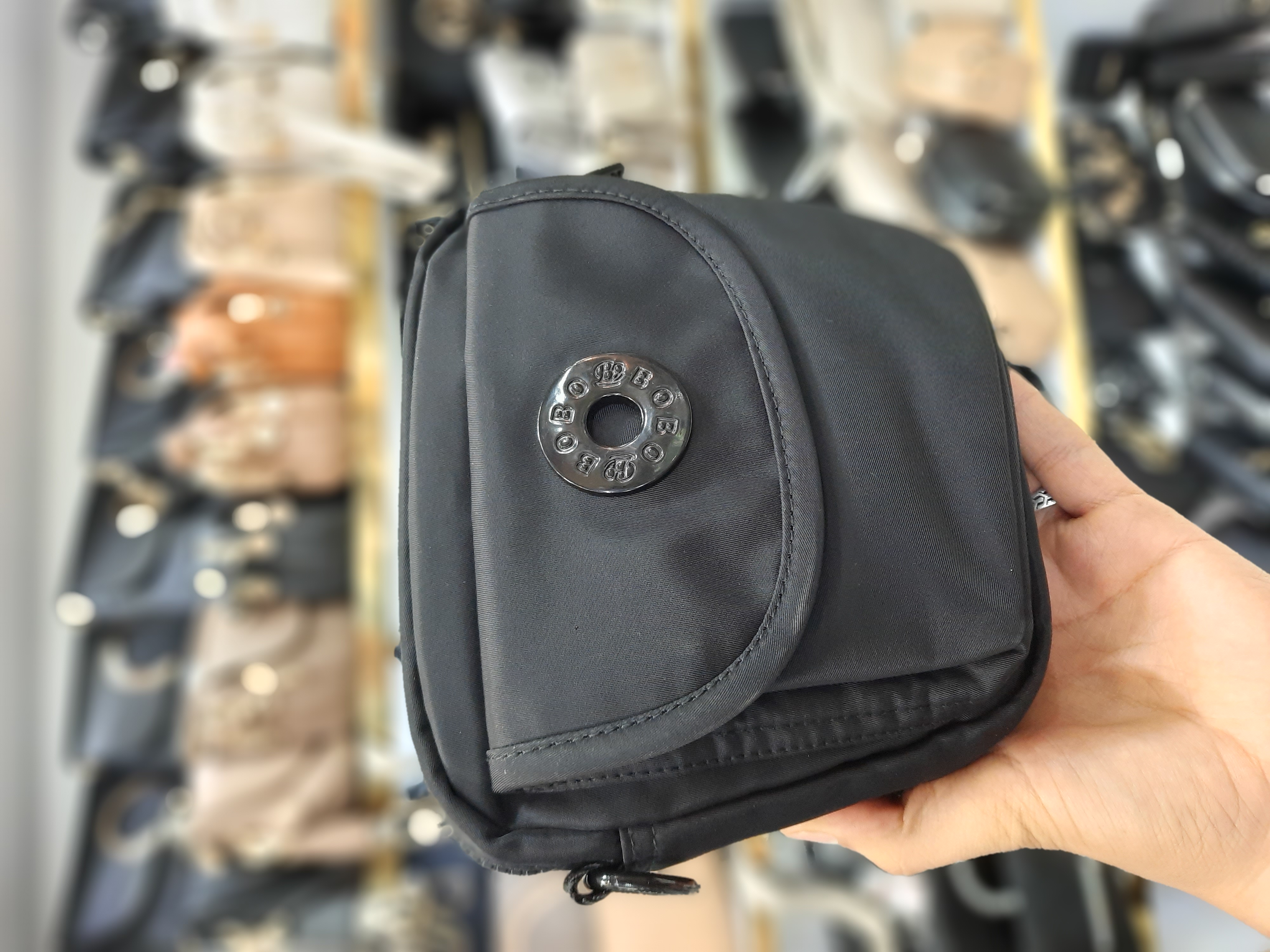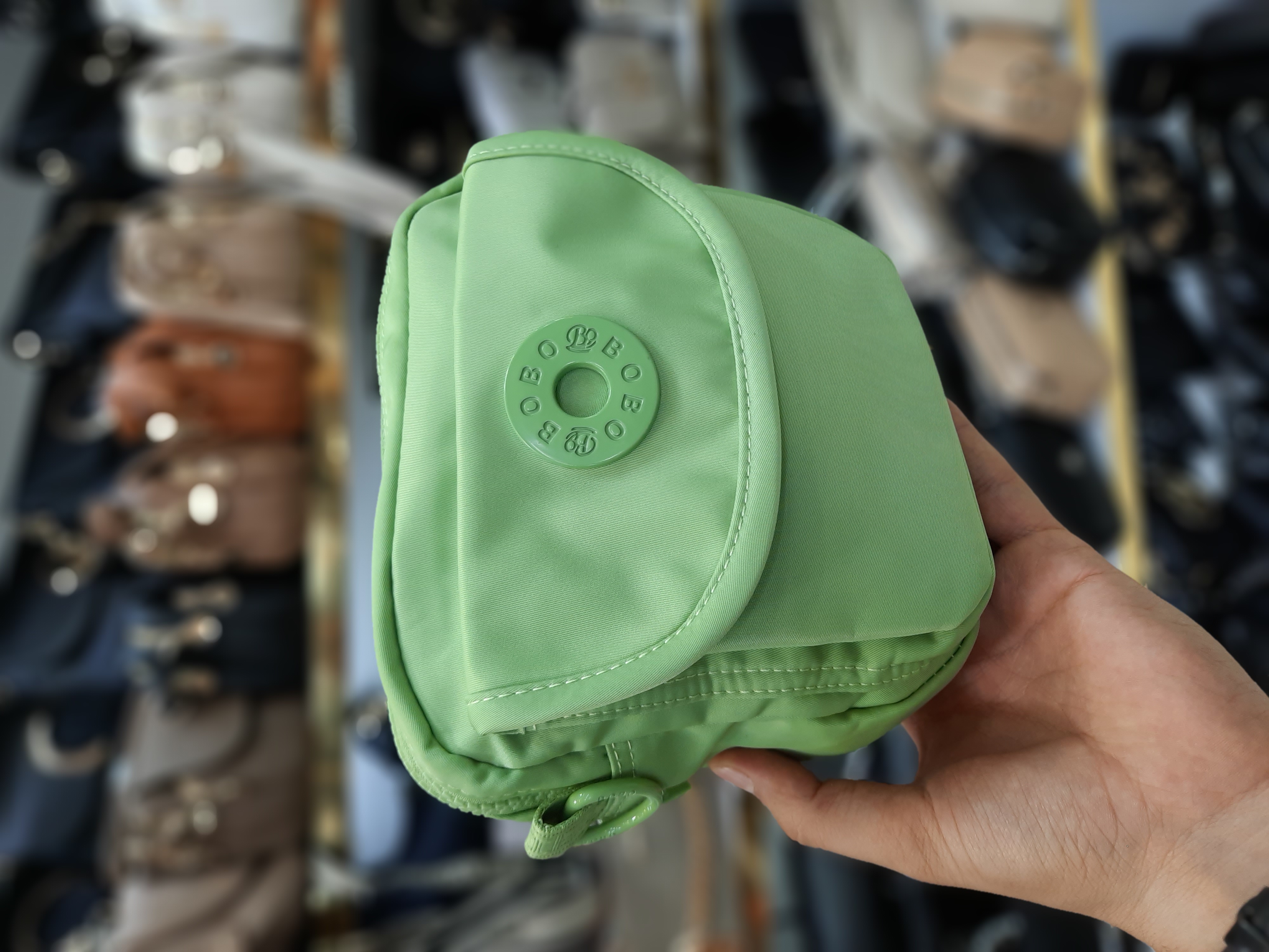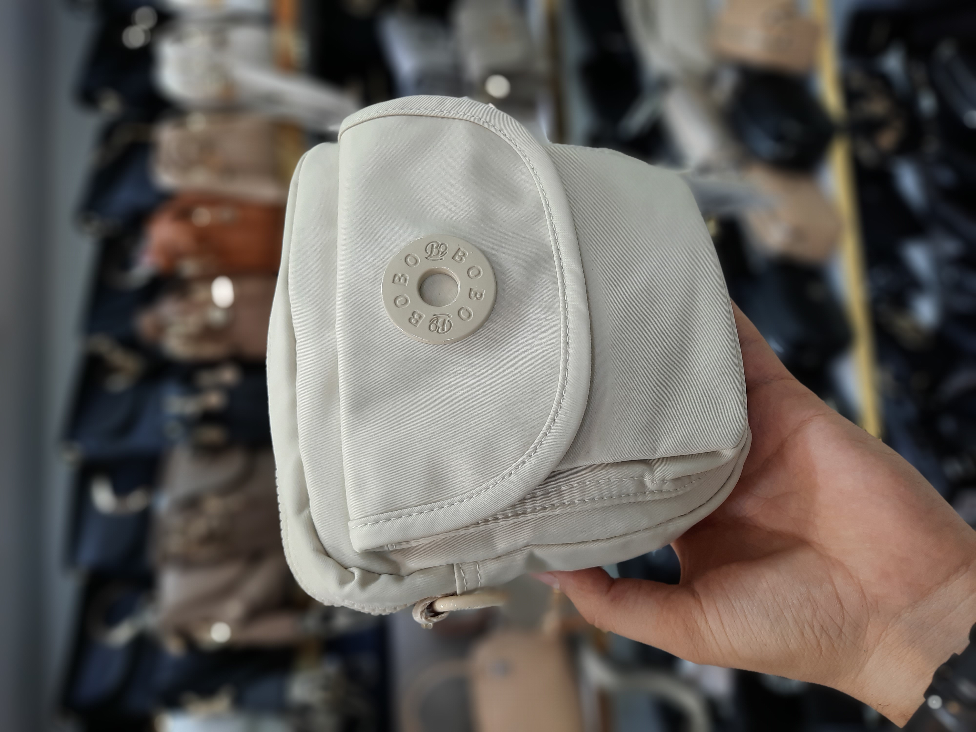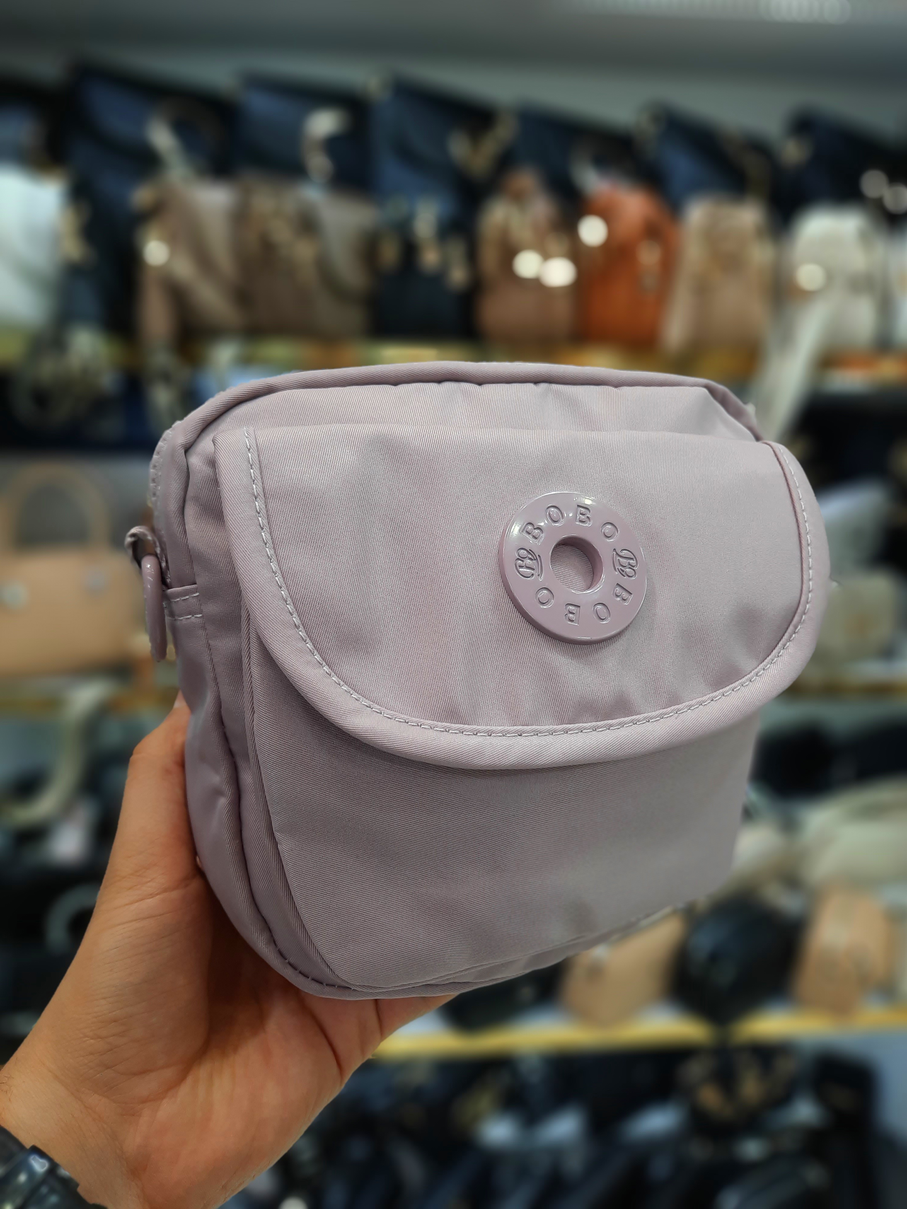 جنس برزنت درجه یک جلوی کار جیب با دکمه مگنتی (آهنربایی) ضدآب قابل شستشو دارای بند قابل تنظیم حک برند بوبو روی سرزیپ ها و آستر داخلی ابعاد 18*6*19